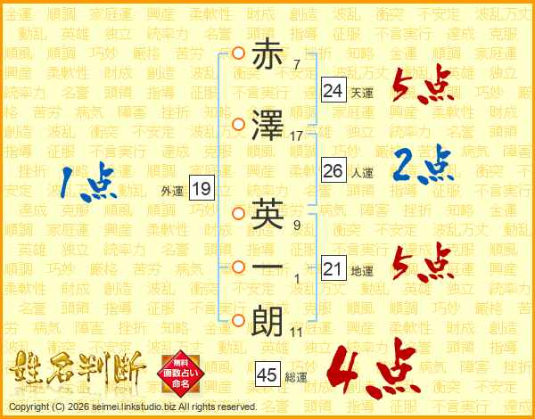 赤(7画)澤(17画) 英(9画)一(1画)朗(11画)