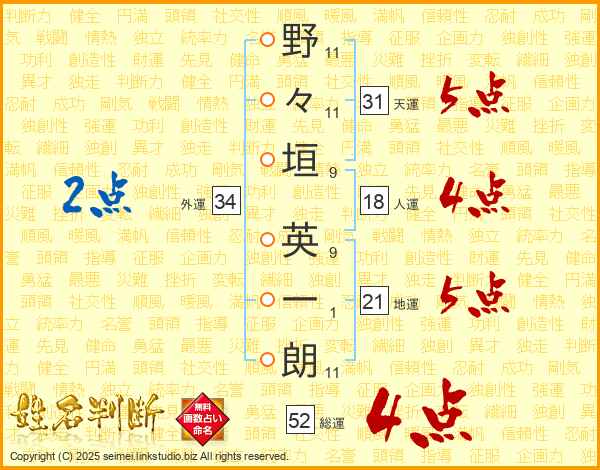 野(11画)々(11画)垣(9画) 英(9画)一(1画)朗(11画)