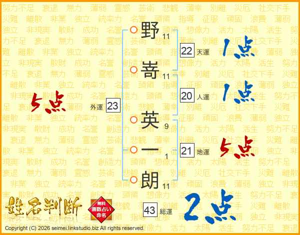 野嵜英一朗さんの人運は20画の1点!