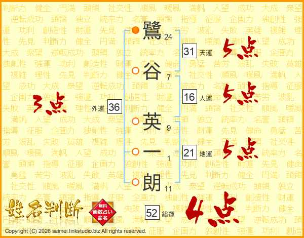鷺(24画)谷(7画) 英(9画)一(1画)朗(11画)