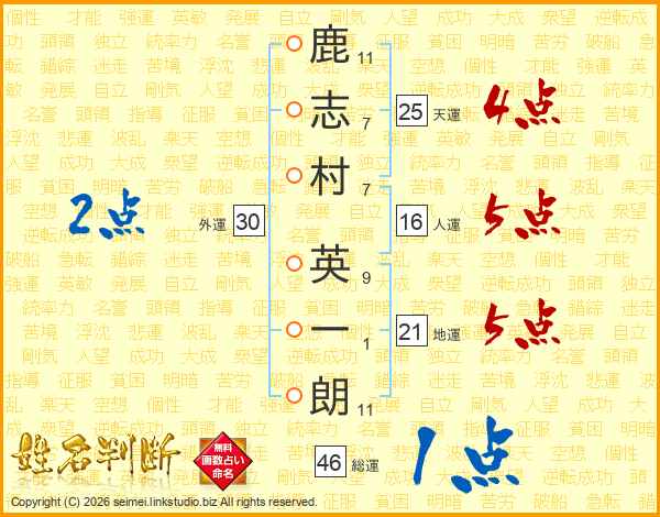 鹿(11画)志(7画)村(7画) 英(9画)一(1画)朗(11画)