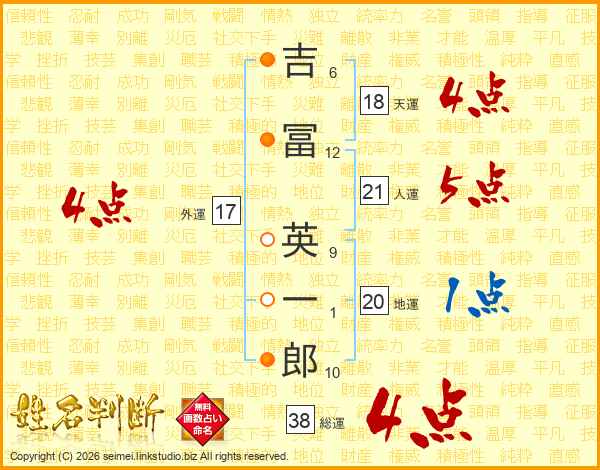 吉(6画)冨(12画) 英(9画)一(1画)郎(10画)