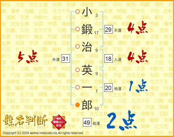 小(3画)鍛(17画)治(9画) 英(9画)一(1画)郎(10画)
