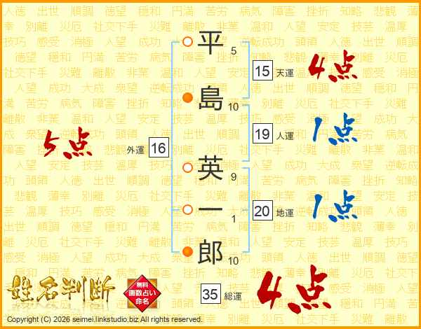 平(5画)島(10画) 英(9画)一(1画)郎(10画)