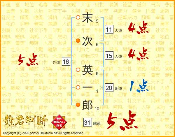 末(5画)次(6画) 英(9画)一(1画)郎(10画)