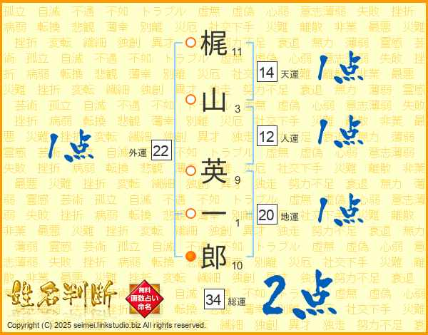 梶(11画)山(3画) 英(9画)一(1画)郎(10画)