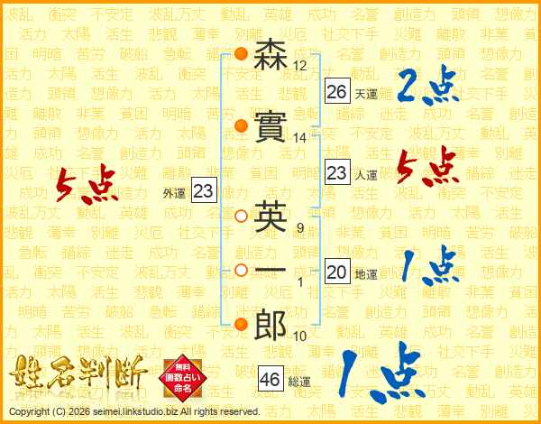 森(12画)實(14画) 英(9画)一(1画)郎(10画)