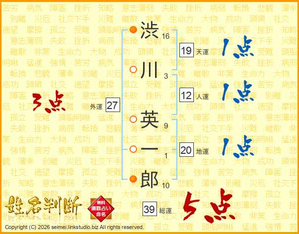 渋(16画)川(3画) 英(9画)一(1画)郎(10画)