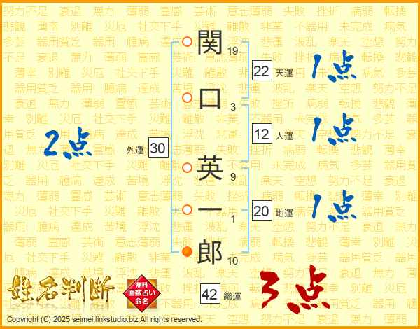 関(19画)口(3画) 英(9画)一(1画)郎(10画)