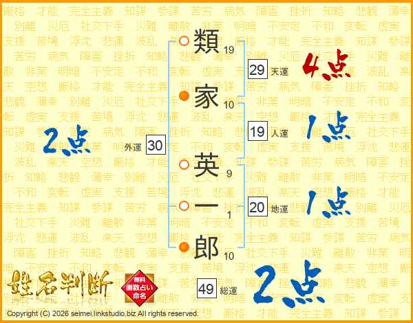 類(19画)家(10画) 英(9画)一(1画)郎(10画)