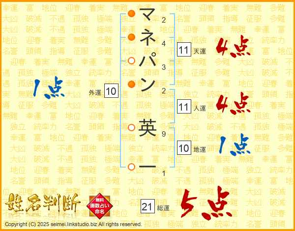 マ(2画)ネ(4画)パ(3画)ン(2画) 英(9画)一(1画)