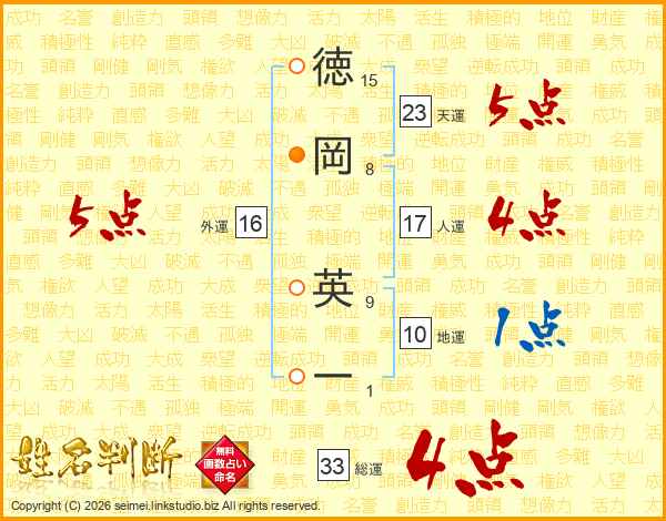 徳(15画)岡(8画) 英(9画)一(1画)