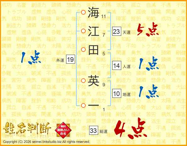 海(11画)江(7画)田(5画) 英(9画)一(1画)