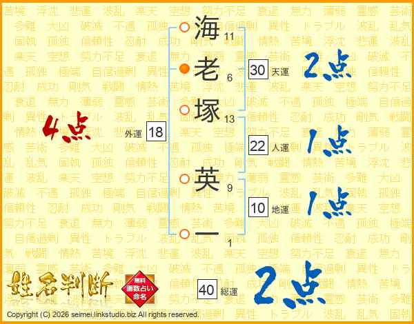 海(11画)老(6画)塚(13画) 英(9画)一(1画)