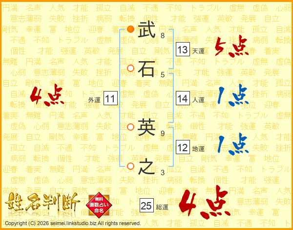 生活面を象徴する運勢です。外部から受ける影響力を表し、結婚運、家庭運や職場、環境への順応性を表します。総運から人運を引いた画数。姓や名が1文字の場合を除く。