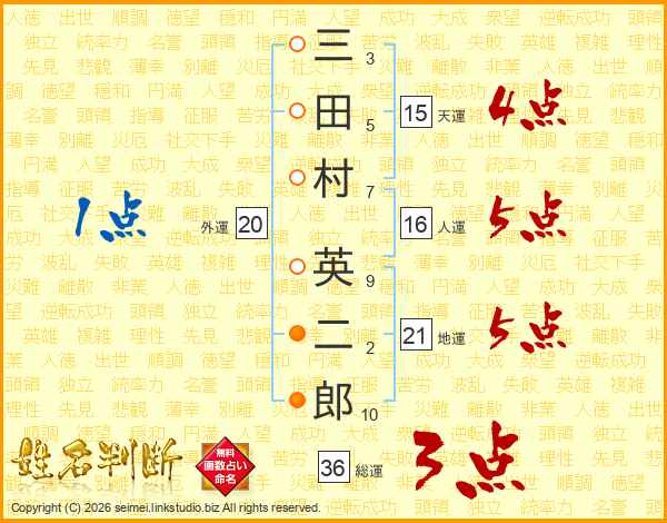 三(3画)田(5画)村(7画) 英(9画)二(2画)郎(10画)