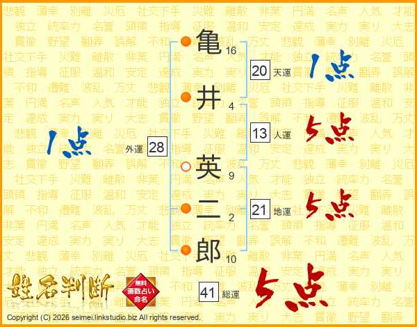 亀(16画)井(4画) 英(9画)二(2画)郎(10画)