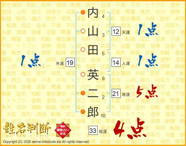 内(4画)山(3画)田(5画) 英(9画)二(2画)郎(10画)