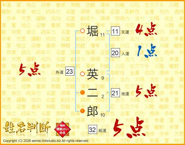 生活面を象徴する運勢です。外部から受ける影響力を表し、結婚運、家庭運や職場、環境への順応性を表します。総運から人運を引いた画数。姓や名が1文字の場合を除く。
