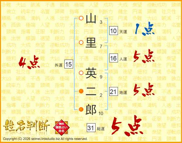 山(3画)里(7画) 英(9画)二(2画)郎(10画)