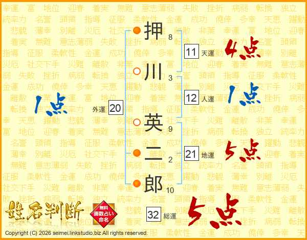 押(8画)川(3画) 英(9画)二(2画)郎(10画)