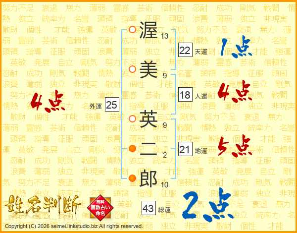 渥(13画)美(9画) 英(9画)二(2画)郎(10画)