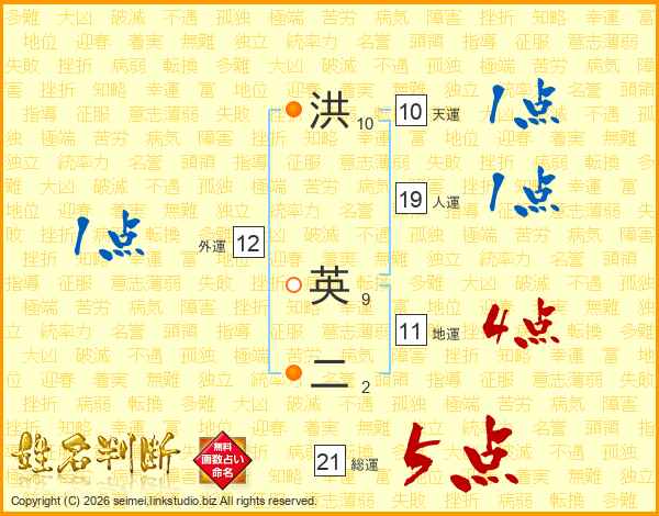 生活面を象徴する運勢です。外部から受ける影響力を表し、結婚運、家庭運や職場、環境への順応性を表します。総運から人運を引いた画数。姓や名が1文字の場合を除く。