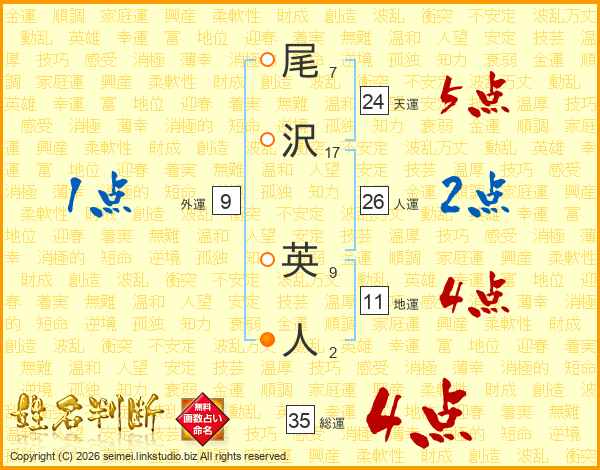 尾(7画)沢(17画) 英(9画)人(2画)