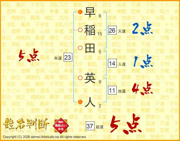早(6画)稲(15画)田(5画) 英(9画)人(2画)