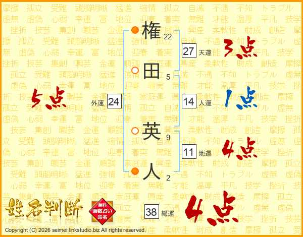 生活面を象徴する運勢です。外部から受ける影響力を表し、結婚運、家庭運や職場、環境への順応性を表します。総運から人運を引いた画数。姓や名が1文字の場合を除く。