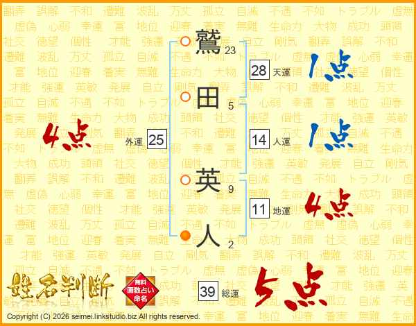 鷲(23画)田(5画) 英(9画)人(2画)