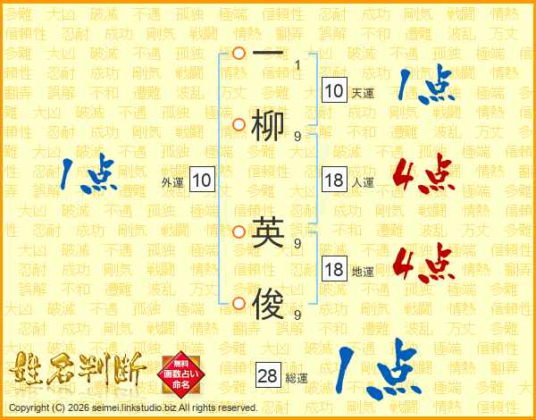 生活面を象徴する運勢です。外部から受ける影響力を表し、結婚運、家庭運や職場、環境への順応性を表します。総運から人運を引いた画数。姓や名が1文字の場合を除く。