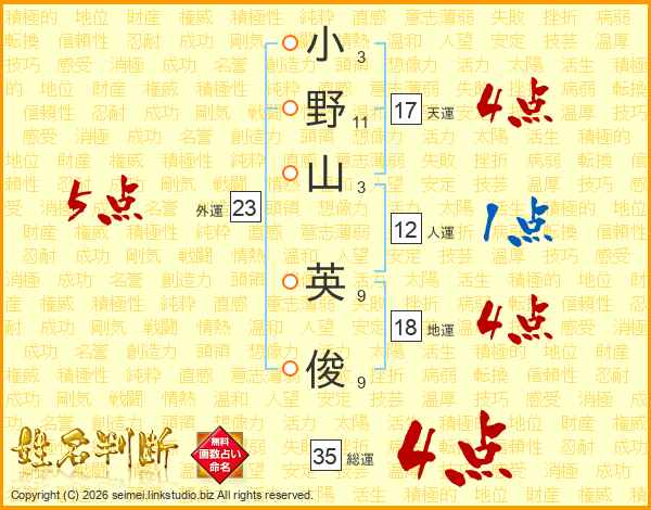 小(3画)野(11画)山(3画) 英(9画)俊(9画)