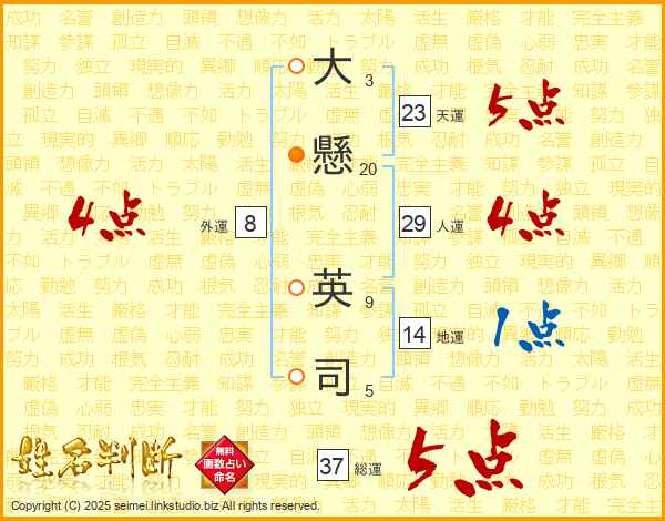 あなたの人生を表す1番重要な運勢です。生涯を通じて影響する総合運となり、主に50歳以降の晩年期に影響を及ぼします。苗字と名前の合計画数。