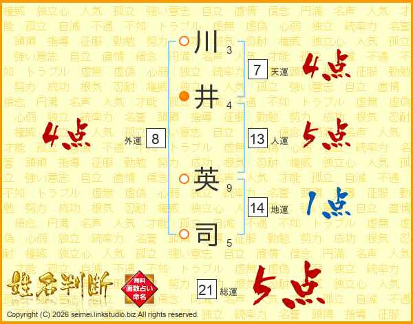 生活面を象徴する運勢です。外部から受ける影響力を表し、結婚運、家庭運や職場、環境への順応性を表します。総運から人運を引いた画数。姓や名が1文字の場合を除く。