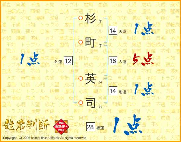 杉(7画)町(7画) 英(9画)司(5画)