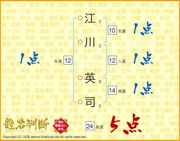 江(7画)川(3画) 英(9画)司(5画)