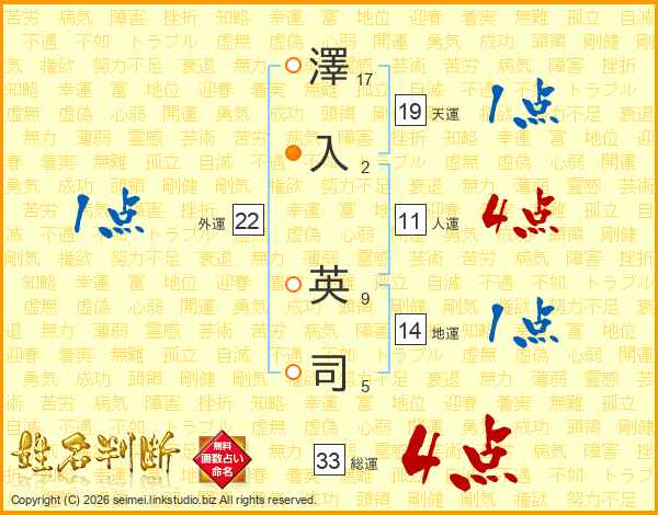 生活面を象徴する運勢です。外部から受ける影響力を表し、結婚運、家庭運や職場、環境への順応性を表します。総運から人運を引いた画数。姓や名が1文字の場合を除く。
