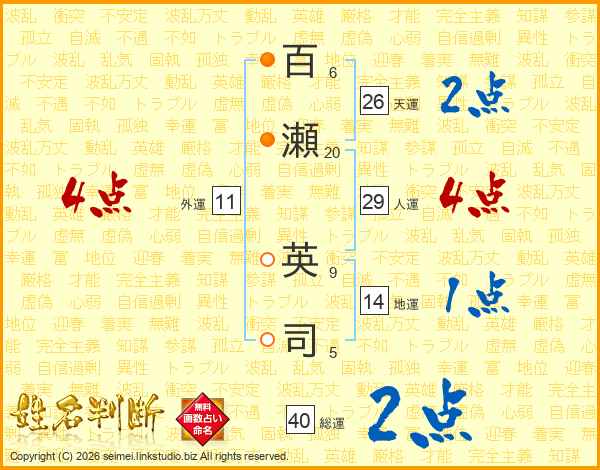 生活面を象徴する運勢です。外部から受ける影響力を表し、結婚運、家庭運や職場、環境への順応性を表します。総運から人運を引いた画数。姓や名が1文字の場合を除く。