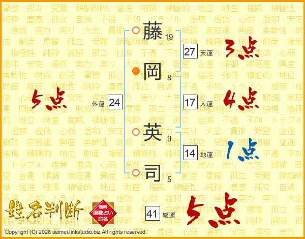 藤(19画)岡(8画) 英(9画)司(5画)