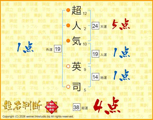 超(12画)人(2画)気(10画) 英(9画)司(5画)