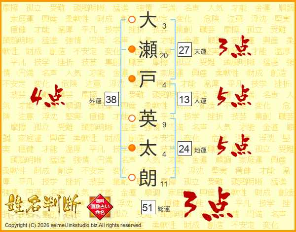 大(3画)瀬(20画)戸(4画) 英(9画)太(4画)朗(11画)