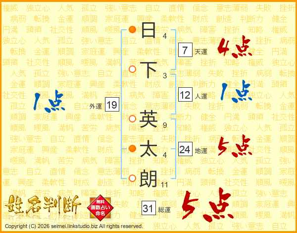 日(4画)下(3画) 英(9画)太(4画)朗(11画)
