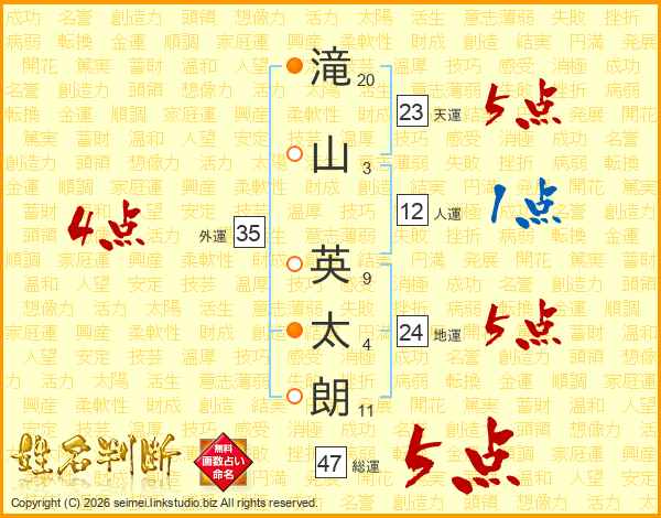 滝(20画)山(3画) 英(9画)太(4画)朗(11画)