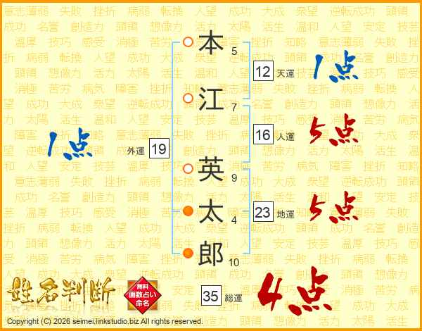 本(5画)江(7画) 英(9画)太(4画)郎(10画)