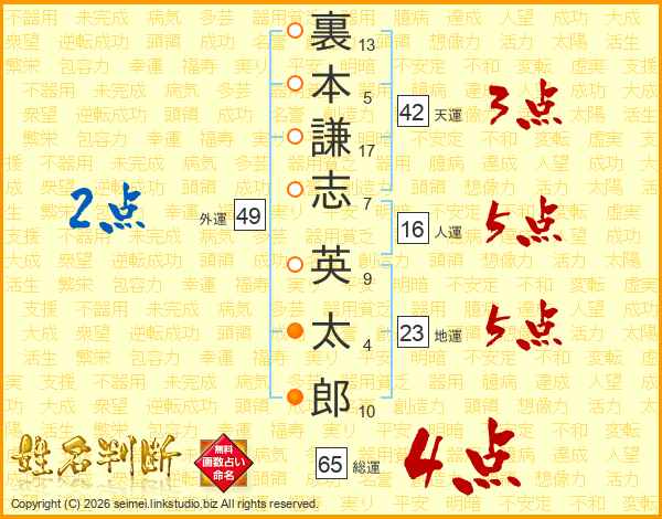 裏(13画)本(5画)謙(17画)志(7画) 英(9画)太(4画)郎(10画)