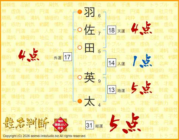 羽(6画)佐(7画)田(5画) 英(9画)太(4画)