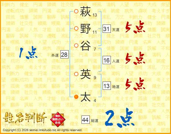 萩(13画)野(11画)谷(7画) 英(9画)太(4画)