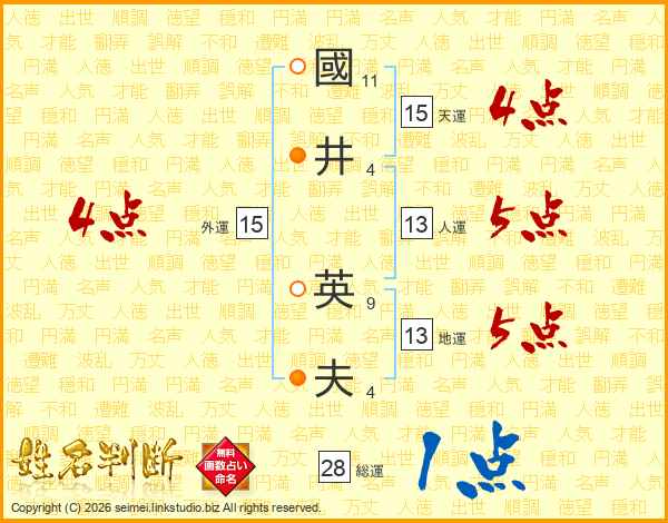 國(11画)井(4画) 英(9画)夫(4画)
