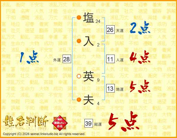 塩(24画)入(2画) 英(9画)夫(4画)